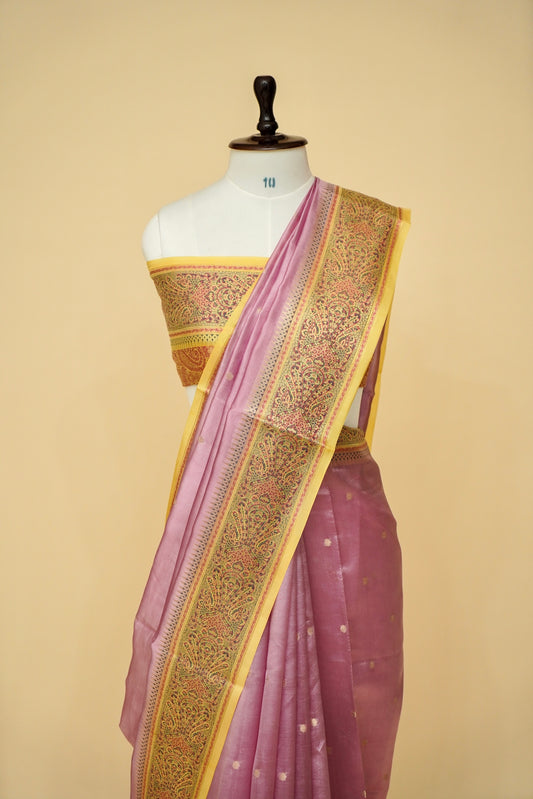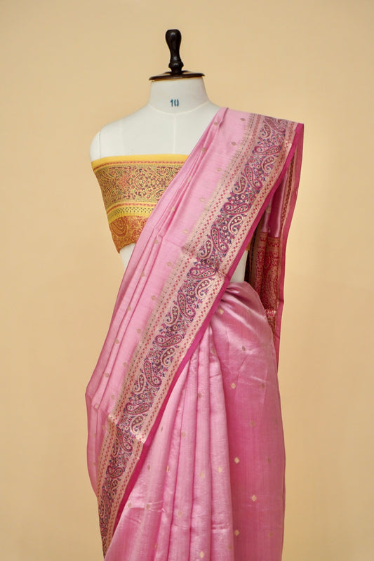 Lightweight Pure Mango Katan Silk Saree in Pink with Jamawar Pallu and Border
