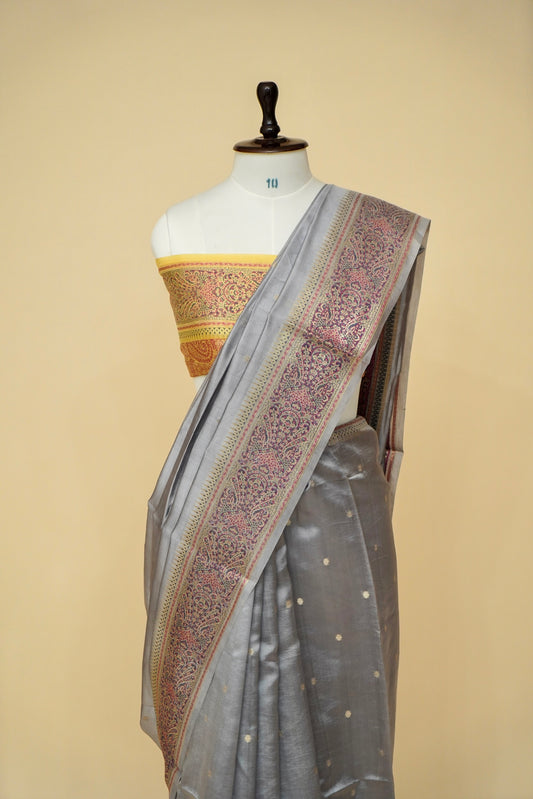 Lightweight Pure Mango Katan Silk Saree in Grey with Jamawar Pallu and Border